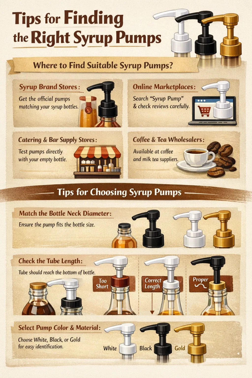 If you're looking for the right syrup pumps but are worried about getting the wrong size, here are some tips for finding them and common purchasing methods: