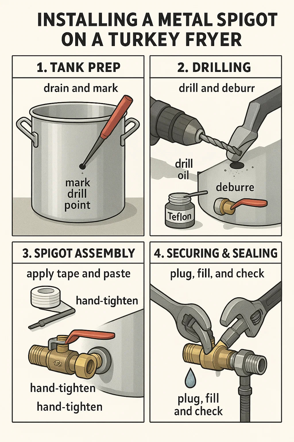 Here's a step-by-step guide for installing a metal spigot on a turkey fryer:
