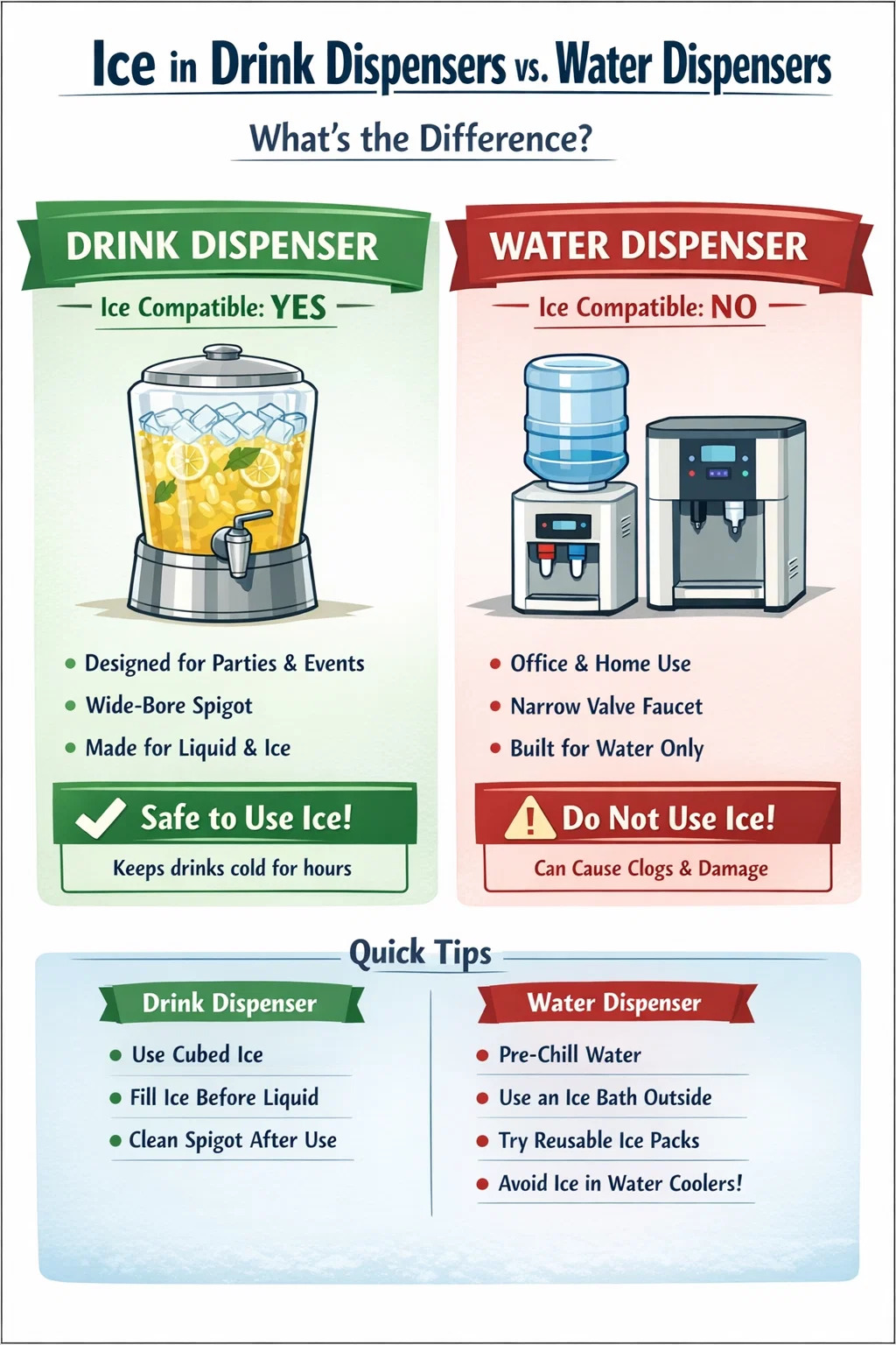 Yes, you can put ice in a drink dispenser — but whether you should depends entirely on the dispenser's design and intended use. Beverage dispensers made for catering, parties, and restaurants are specifically built to hold ice along with drinks. Standard water dispensers and countertop water coolers, however, are not designed for ice, and adding it can damage the water dispenser faucet, clog the spigot mechanism, and cause leaks. Knowing which category your dispenser falls into — and how to use ice safely if it's compatible — makes a significant difference in how long the equipment lasts and how well it functions.