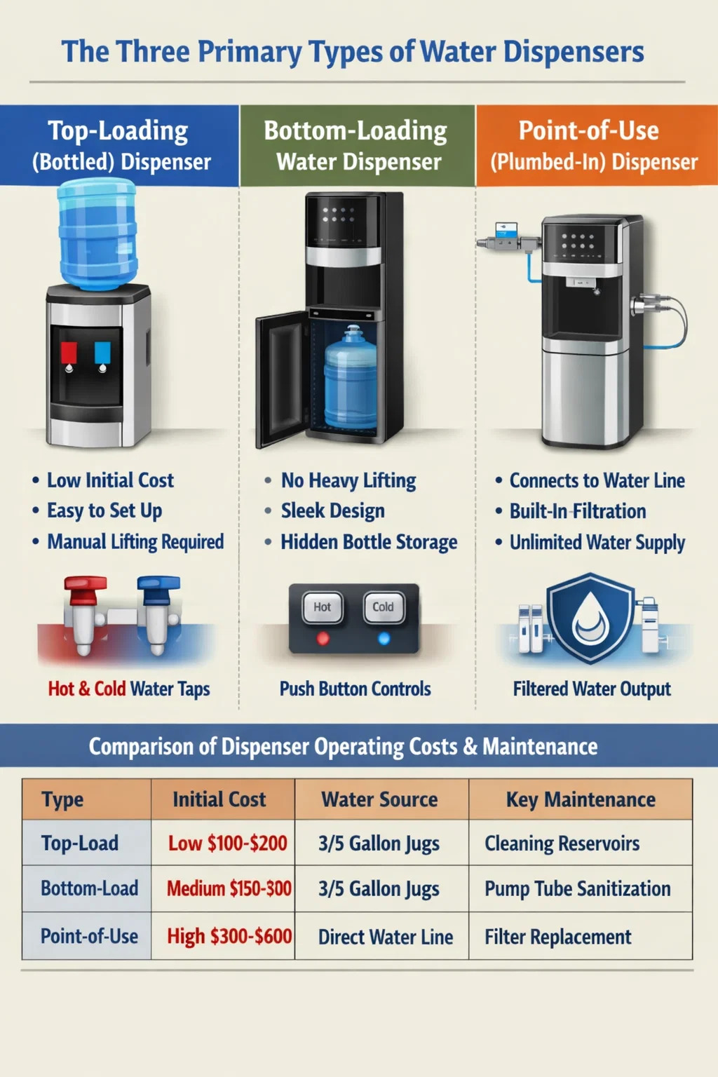 Making the right choice involves balancing convenience with infrastructure. If you are in a rental property where you cannot modify the plumbing, a bottled dispenser (top or bottom load) is the logical choice. For those who own their home or manage a large office, a POU system provides the best long-term value by eliminating the logistical headache of ordering and storing heavy jugs.
