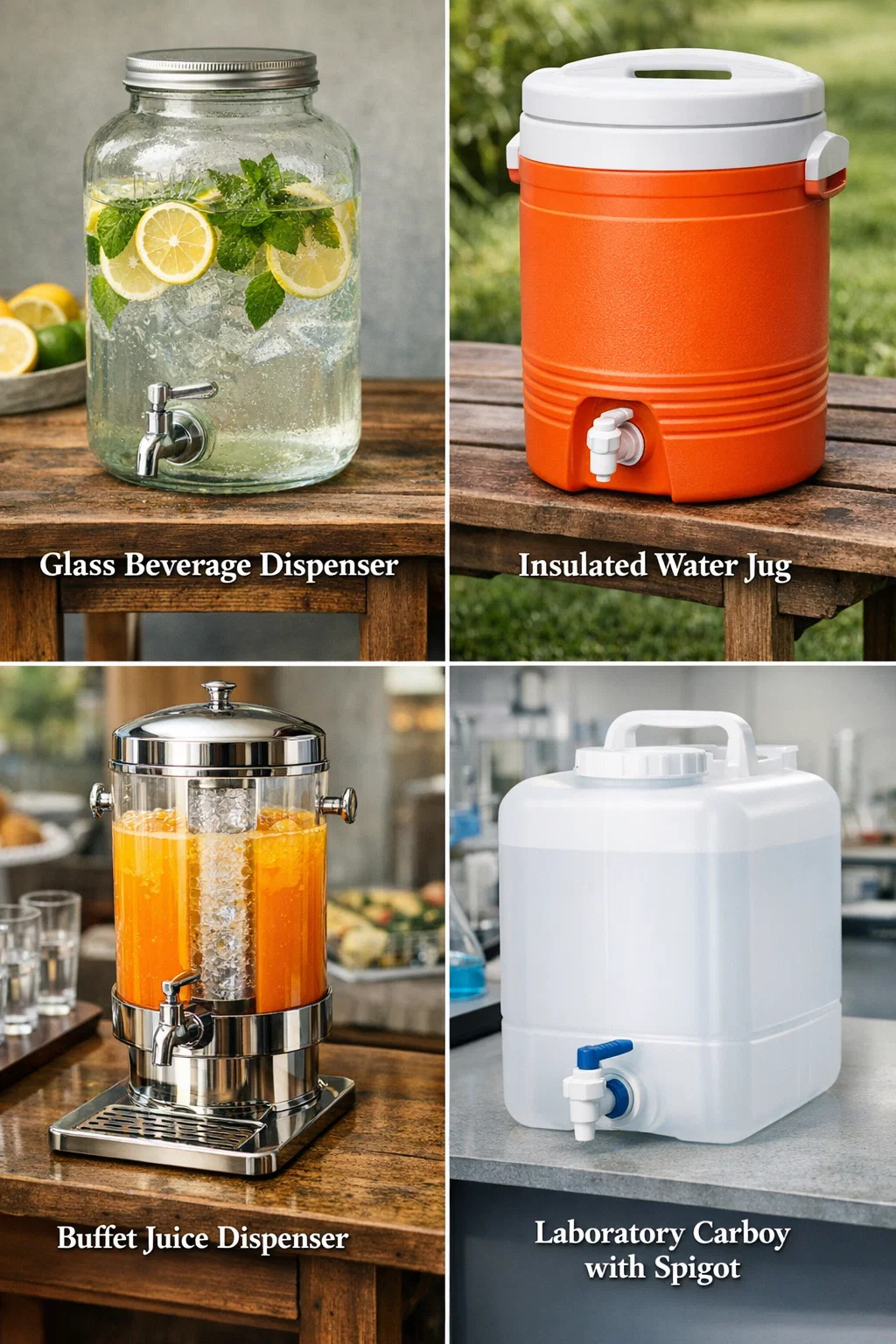 This type of beverage container with a spigot (faucet/tap) has many different names in everyday life, depending on its shape, material, and the context in which it is used.